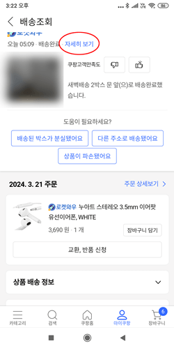 시간과 현재위치 배송상태를 확인할 수 있으며 만약 배송도착이라는 문자를 받았는데 문 앞에 택배가 없으면 바로 아래에 보이는 `도움이 필요하세요?`에서 `배송된 박스가 분실됐어요`,`다른 주소로 배송됐어요`,`상품이 파손됐어요`. 에서 도움을 받으수 있습니다.