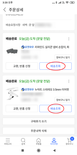 내가 구매한 제품 목록이 보입니다. 오른쪽에 있는 `배송조회`를 누르고 들어갑니다.