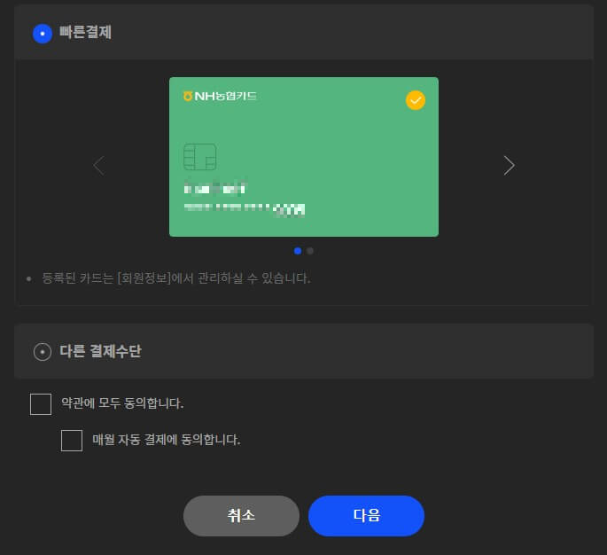 선택한 요금제의 내용이 보이고 결제수단 선택에서 카드 등록을 해주면 됩니다.