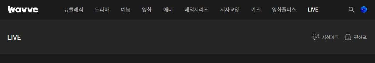 웨이브사이트 상단을 보면 뉴클래식, 드라마, 예능, 영화, 애니, 해외시리즈, 시사교양, 키즈, 영화플러스, Live 등 다양한 메뉴에 있는 프로그램들을 시청할 수 있습니다.