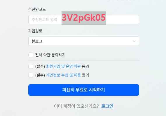 퍼센티 가입 시 추천인 코드 3v2pGk05을 입력하면 특별한 혜택을 누릴 수 있습니다.무료 체험을 위해 처음 회원 가입시 추천인코드를 입력해야만 추가연장 헤택을 받을 수 있으므로 잊지말고 꼭 입력하시기 바랍니다.